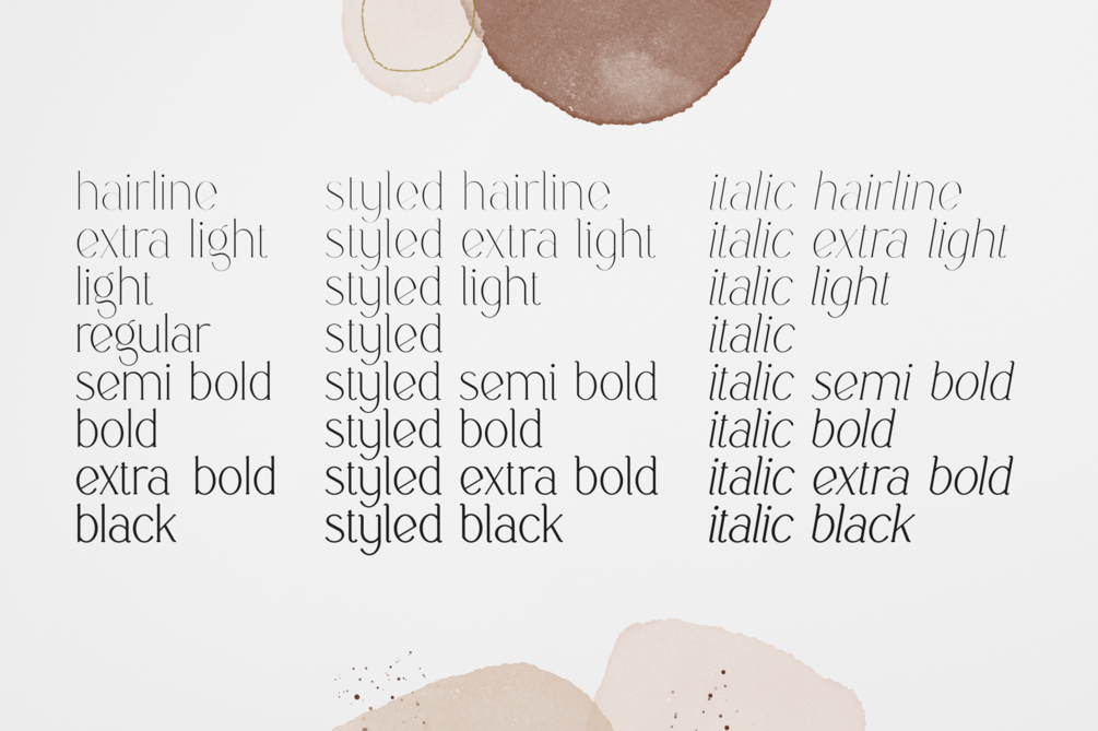 • Styled ( hairline, extra light, light, regular, semi bold, bold, extra bold, black )